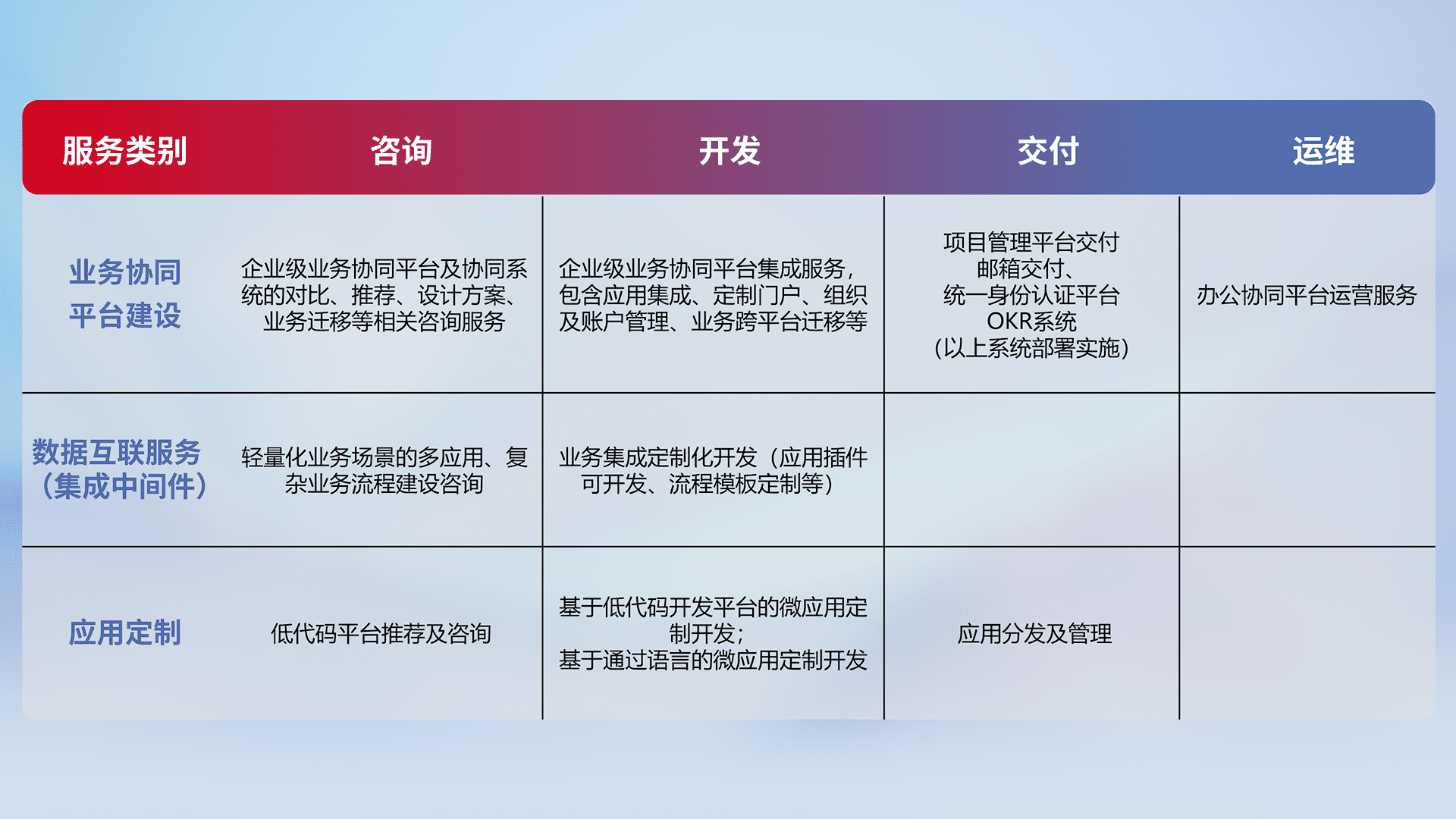针对钉钉、、、企微、、、IDaas等平台级产品提供产品的规划、、、、方案、、、交付、、、定制化开发等服务,,,,实现如统一协同办公、、、、智能客户服务、、、、混合会议管理、、、智能数据查询、、、、等业务场景,,,实现数字化转型。。。